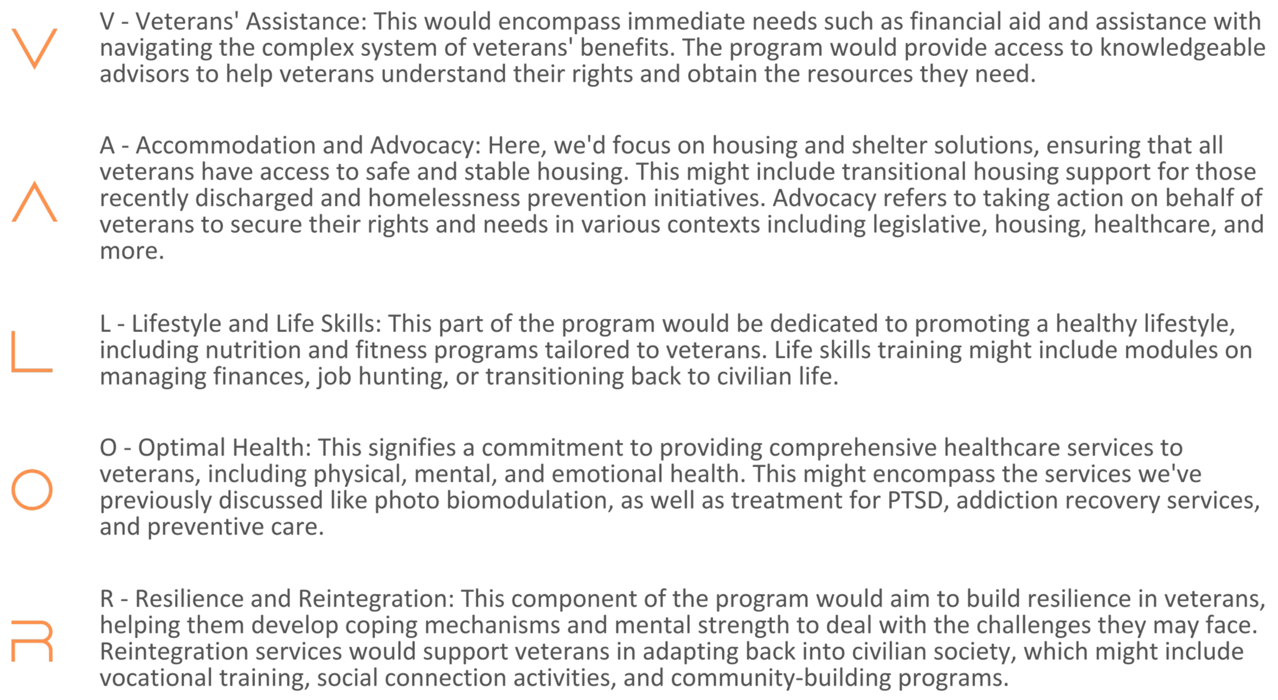Program Components:1. Medical Care: This program provides exceptional medical care to manage and mitigate common conditions prevalent among veterans, such as diabetes and heart disease. Our medical team is experienced in managing complex health conditions, ensuring veterans receive optimal care. We will implement rotating clinical services to the site for outpatient services, such as podiatry, wound management, and diabetes management. Some services can be integrated by telemedicine, while others require direct presence.2. Psychiatric Services: Recognizing the prevalence of mental health issues among veterans, we offer comprehensive psychiatric services. This includes treatment for PTSD, anxiety, depression, and addiction, delivered by skilled mental health professionals experienced in veteran care.3. Functional Medicine: This innovative approach to healthcare seeks to identify and address the root causes of disease. By considering the complex web of interactions in each veteran's history, physiology, and lifestyle that can lead to illness, the program provides personalized treatment plans that leverage diet, exercise, stress management, and other natural therapies to restore health.4. Nutritional Intervention: We strongly emphasize nutrition in line with functional medicine principles. Veterans receive personalized dietary plans to manage chronic conditions, enhance overall health, and promote recovery. Nutritional plans are based on whole, unprocessed foods and consider each individual's preferences and needs. The goal is to improve the gut-immune-brain triad and reduce metabolic inflammation.5. Substance Dependence Rehabilitation: For veterans battling substance dependence, we offer dedicated rehabilitation services. This includes medically supervised detoxification, individual and group therapy, and ongoing support to maintain sobriety.6. Post-Traumatic Stress Disorder (PTSD) Management Program: Catering specifically to veterans, this program employs a comprehensive approach to managing PTSD. This condition can manifest after experiencing intense combat situations or military service-related trauma. Drawing on evidence-based therapeutic methods, the program incorporates individual therapy, group counseling, cognitive-behavioral techniques, and exposure therapy, all aimed at helping individuals process traumatic experiences, manage distressing symptoms, and build resilience. A vital component of the program is the focus on personalized care; each participant's treatment plan is tailored to their specific symptoms and needs, acknowledging that everyone's experience with PTSD is unique. This can also include medication management as appropriate, as well as alternative therapeutic modalities such as Eye Movement Desensitization and Reprocessing (EMDR), trauma-informed yoga, and mindfulness techniques.7. Transitional Housing: Safe, comfortable housing is essential to recovery and reintegration. Our transitional housing offers veterans a place to live while they receive treatment and prepare to transition back into society.8. Work Re-Education Program: We understand veterans' challenges in transitioning back into the workforce. Our work re-education program provides veterans with job skills training, career counseling, and job placement services to help them find meaningful employment post-recovery.